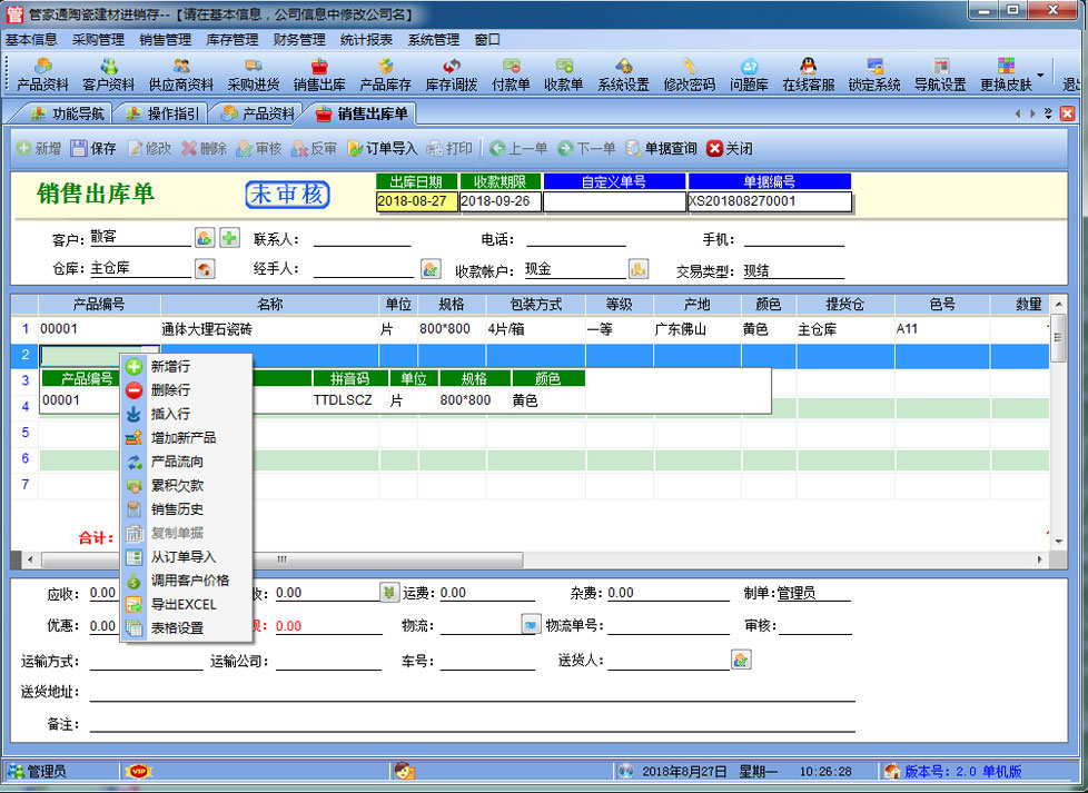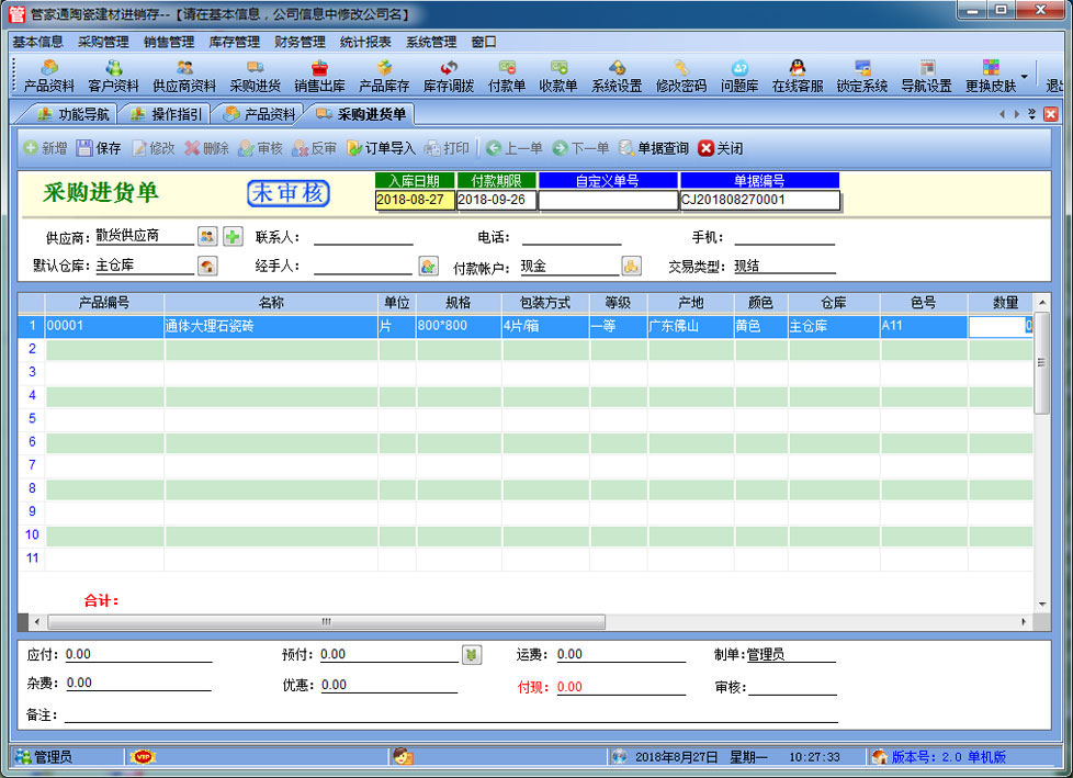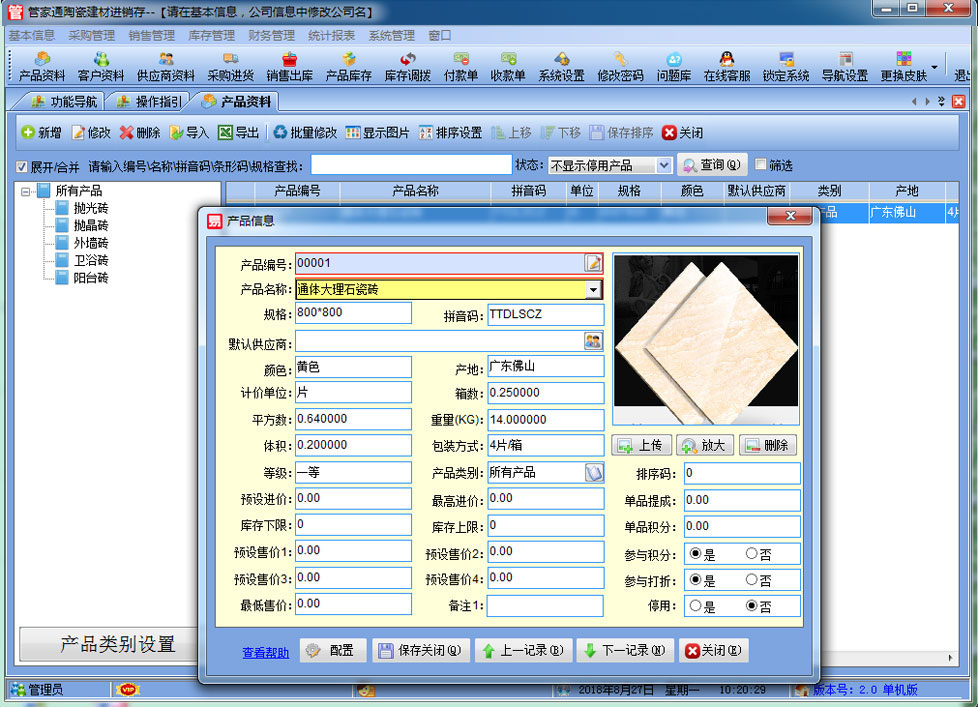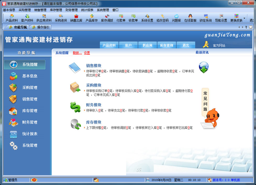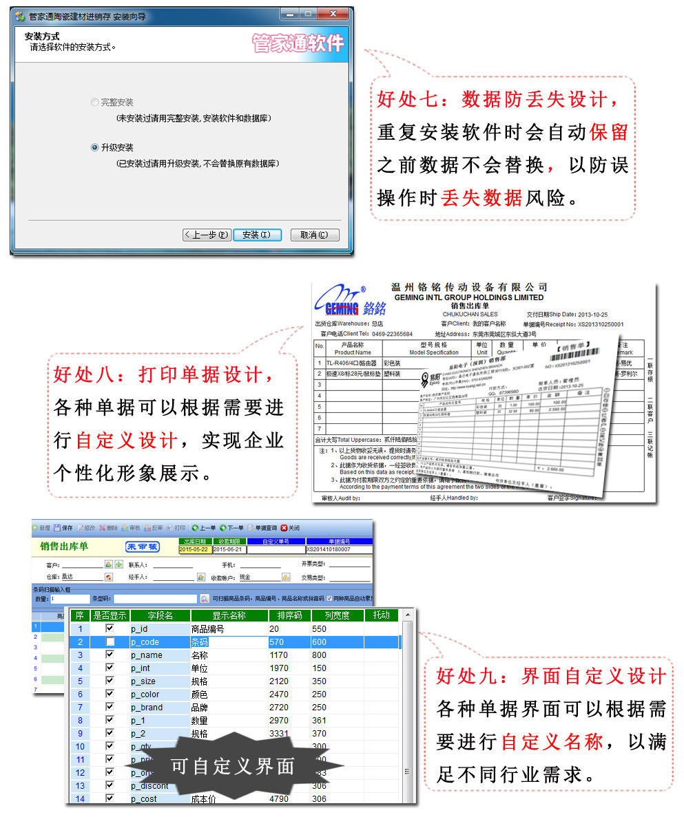 | 管家通陶瓷建材進銷存是一款專業的瓷磚銷售管理軟件,針對陶瓷建材行業的特點設計,如瓷磚的色號管理,其中包含商品銷售管理系統 ,庫存管理系統(倉庫管理系統),財務和報表系統等子模塊。軟件界面設計簡潔,美觀,其人性化的軟件流程,使普通用戶不需培訓也能很快掌握軟件操作使用方法,上手極易。強大報表與集成查詢功能是本軟件的最大特色,所有功能在用戶需要的使用地方自然體現,不用打開多個窗口重復查詢。管家通進銷存軟件廣泛適用于企業,商貿公司,個體門店等用于商業銷售管理, 庫存管理,財務管理等,客戶管理,員工管理等場合,是您企業進行信息化管理的強大工具。 基礎數據:商品信息,供應商,客戶,商品分類,倉庫,銀行等基本信息的設置。 入庫管理:進行貨品采購入庫,采購退貨,進貨單據和退貨單據查詢,供應商往來帳務,供應商付款。 出庫管理:銷售出貨,客戶退貨,銷售單據和客戶退貨查詢,客戶往來帳務,客戶付款。 庫存管理:包括庫存之間貨品調拔,庫存報損、報溢,庫存盤點功能。 統計報表:完整的統計查詢功能,每張單據每次業務金額都可以清楚的反映。 權限管理:可添加刪除系統操作員帳號,強大的權限控制,可以設置某用戶對某窗口某個按鈕的權限。 打印設計:可對系統內每個單據進行打印的格式設計,可以導出,導入,每個操作員可設計自己的打印格式。 界面設計:系統窗口界面名稱可以自定義設計,表格的顯示順序,寬度,是否顯示等,每個操作員可以設計自己的界面。 系統設置:可以靈活設置系統小數位數,可選0-6位,讓帳務更精確,可對以往數據進行選擇性的清除,以便系統初始化。 數據備份:可隨時對系統數據庫進行安全備份,以防數據丟失。 |