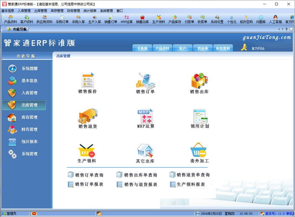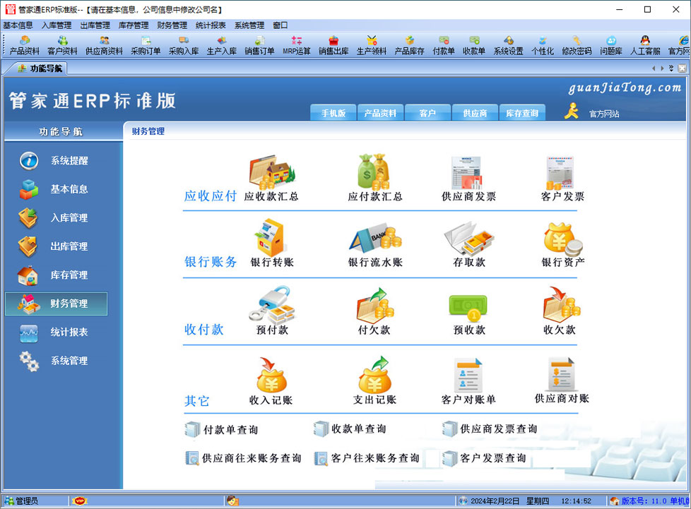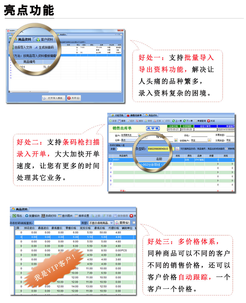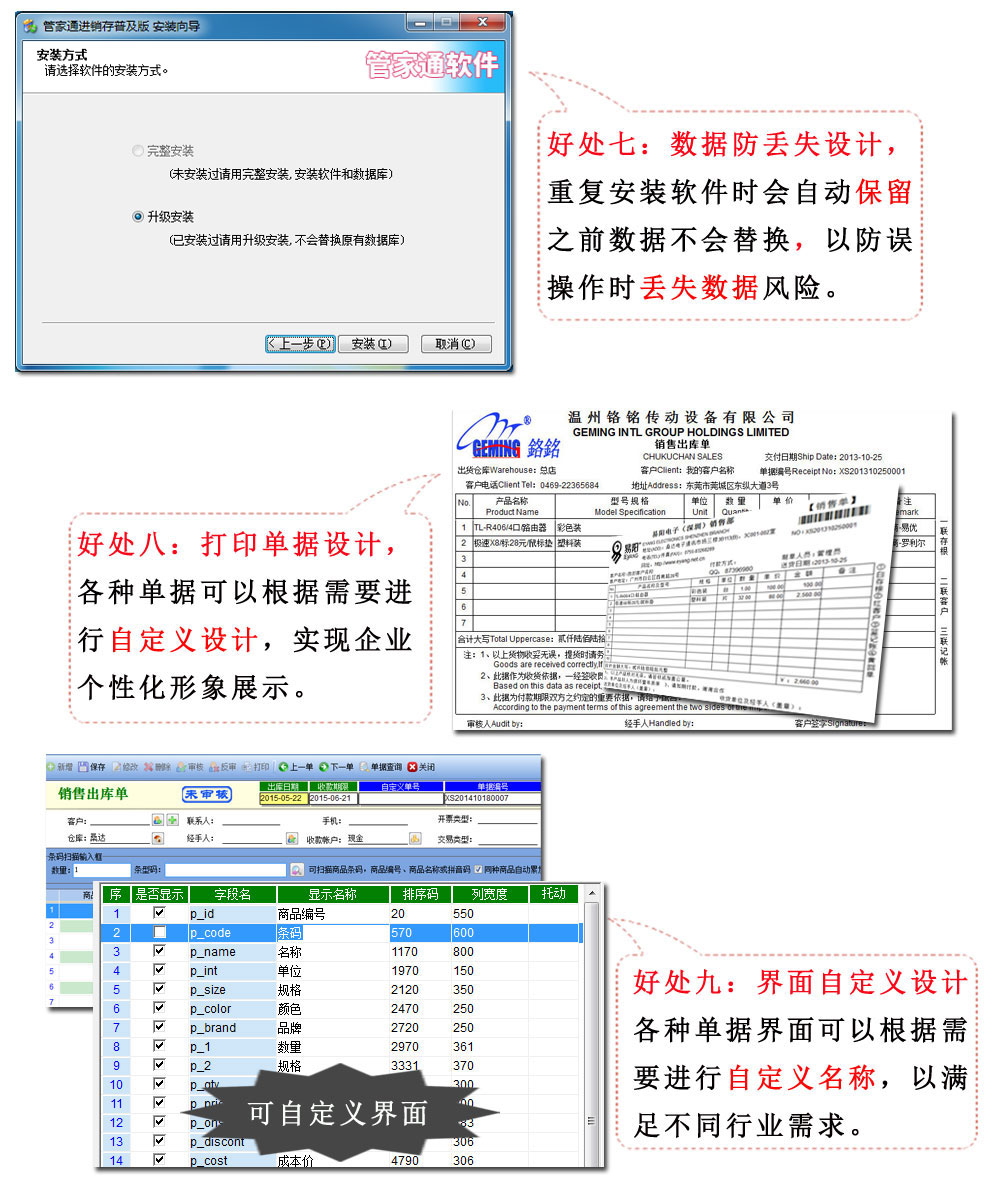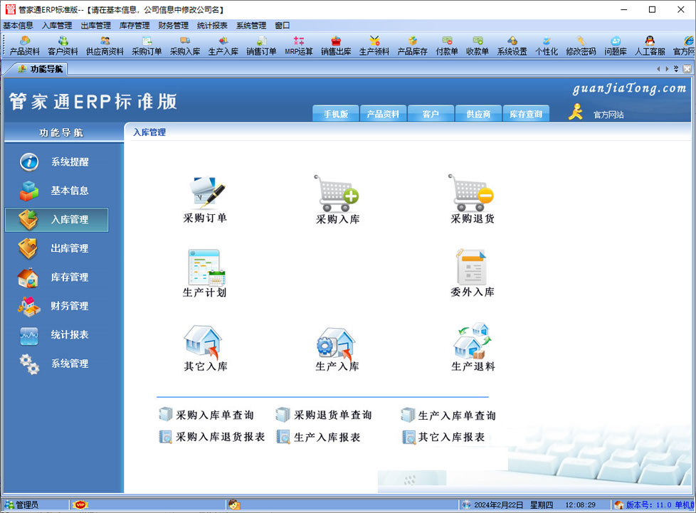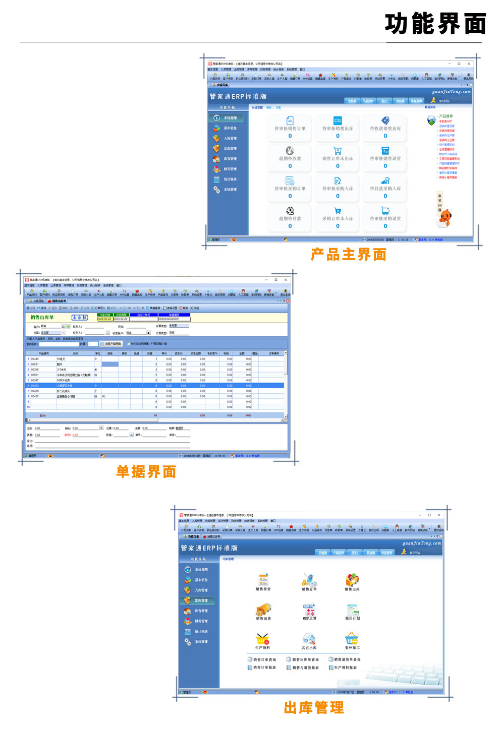 管家通ERP標準版是一款專業的生產制造企業的ERP管理軟件,可對成品的BOM設置,客戶訂單下達后根據BOM進行MRP物料需求運算。其中包含產品銷售管理系統 ,庫存管理系統(倉庫管理系統),財務和報表系統等子模塊。軟件界面設計簡潔,美觀,其人性化的軟件流程,使普通用戶不需培訓也能很快掌握軟件操作使用方法,上手極易。強大報表與集成查詢功能是本軟件的最大特色,所有功能在用戶需要的使用地方自然體現,不用打開多個窗口重復查詢。管家通ERP標準版廣泛適用于企業,商貿公司等用于商業銷售管理, 庫存管理,財務管理等,客戶管理,員工管理等場合,是您企業進行信息化管理的強大工具。 入庫管理:進行產品采購入庫,采購退貨,采購入庫,委外加工入庫。 出庫管理:銷售訂單,銷售出庫,客戶退貨,生產計劃,MRP物料需求運算,委外加工發料。 庫存管理:包括庫存之間貨品調拔,庫存報損、報溢,庫存盤點功能。 財務管理:預付款、預收款,應收應付款,收入支出,,供應商往來帳務,供應商付款,客戶往來帳務,客戶付款 。 統計報表:完整的統計查詢功能,每張單據每次業務金額都可以清楚的反映。 權限管理:可添加刪除系統操作員帳號,強大的權限控制,可以設置某用戶對某窗口某個按鈕的權限。 打印設計:可對系統內每個單據進行打印的格式設計,可以導出,導入,每個操作員可設計自己的打印格式。 界面設計:系統窗口界面名稱可以自定義設計,表格的顯示順序,寬度,是否顯示等,每個操作員可以設計自己的界面。 系統設置:可以靈活設置系統小數位數,可選0-6位,讓帳務更精確,可對以往數據進行選擇性的清除,以便系統初始化。 數據備份:可隨時對系統數據庫進行安全備份,以防數據丟失。 |
