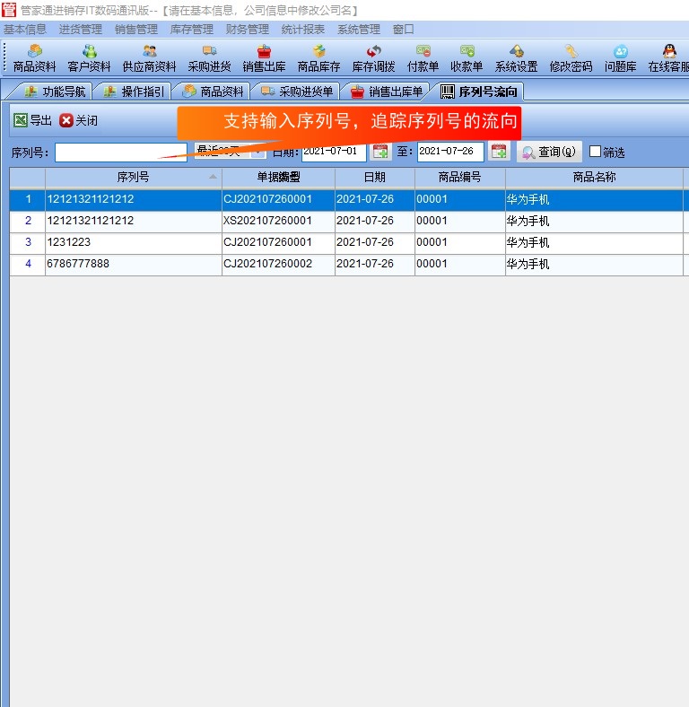 商品是什么時間從哪個供應商采購回來的,什么時間銷售給了哪個客戶。下面給大家推薦一款支持序列號管理的軟件-管家進銷存IT數碼通訊版本。