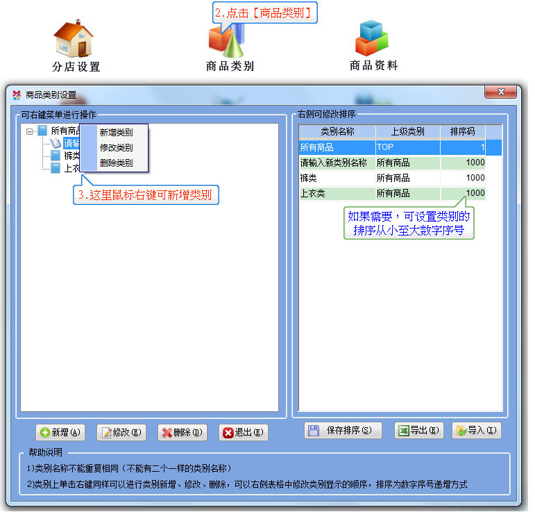 操作說明:在導航【基本信息】模塊中點擊【商品類別】打開如圖所示,在左邊類別上面點擊右鍵后出菜單,直接添加新類別,下級類別等,輸入分類的名稱即可。