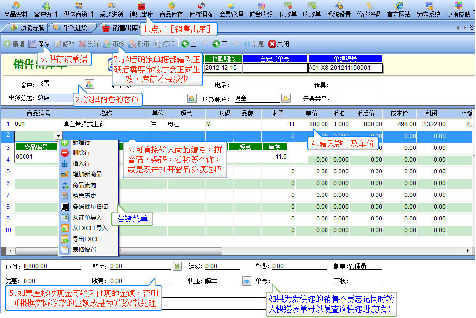 第8步:銷售出庫,將東西賣出去,需要做銷售出庫處理,可以直接點擊工具欄上銷售出庫按鈕打開如圖所示的窗口