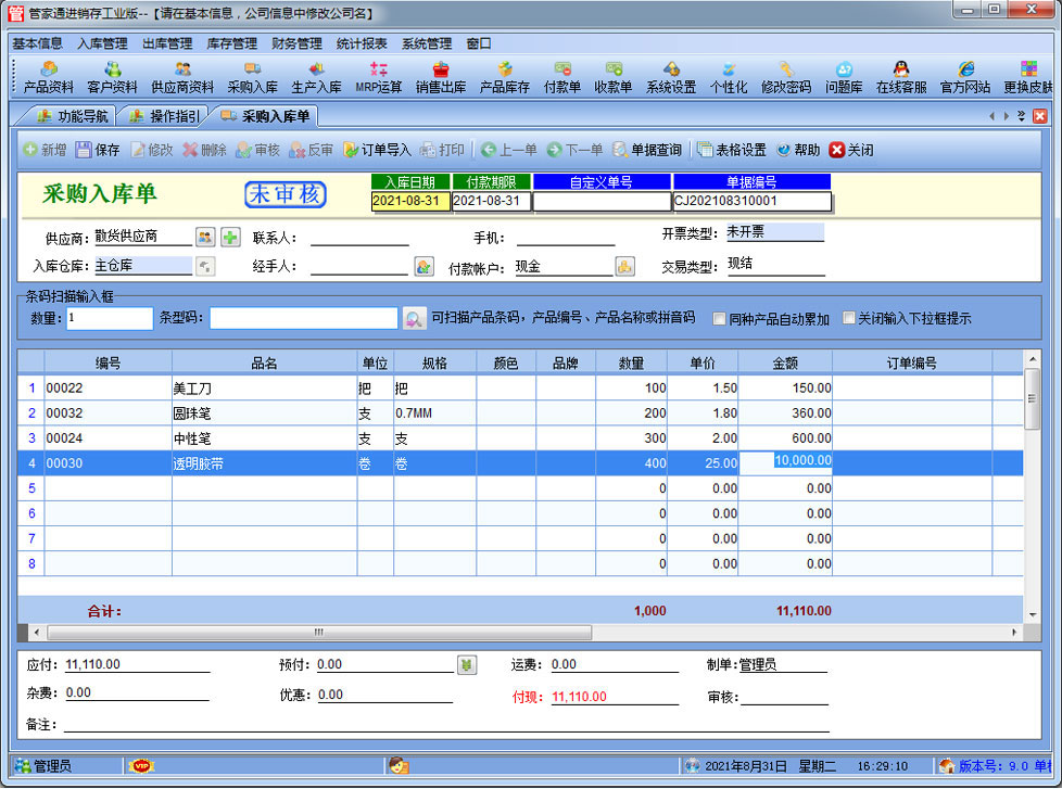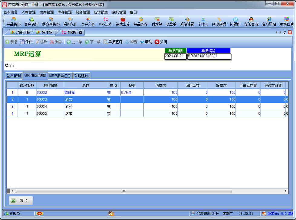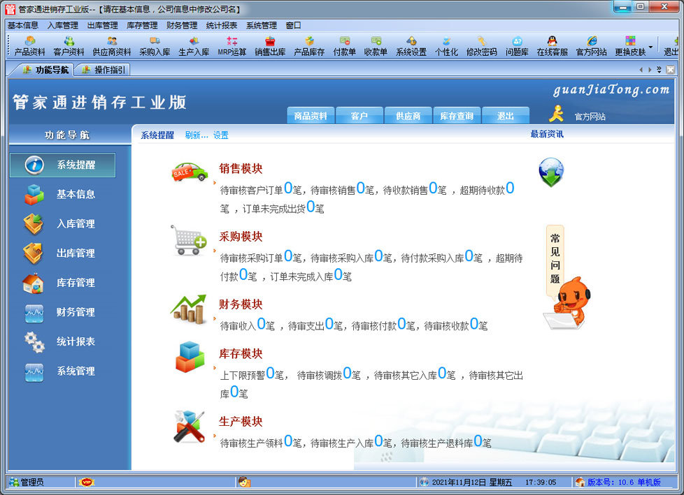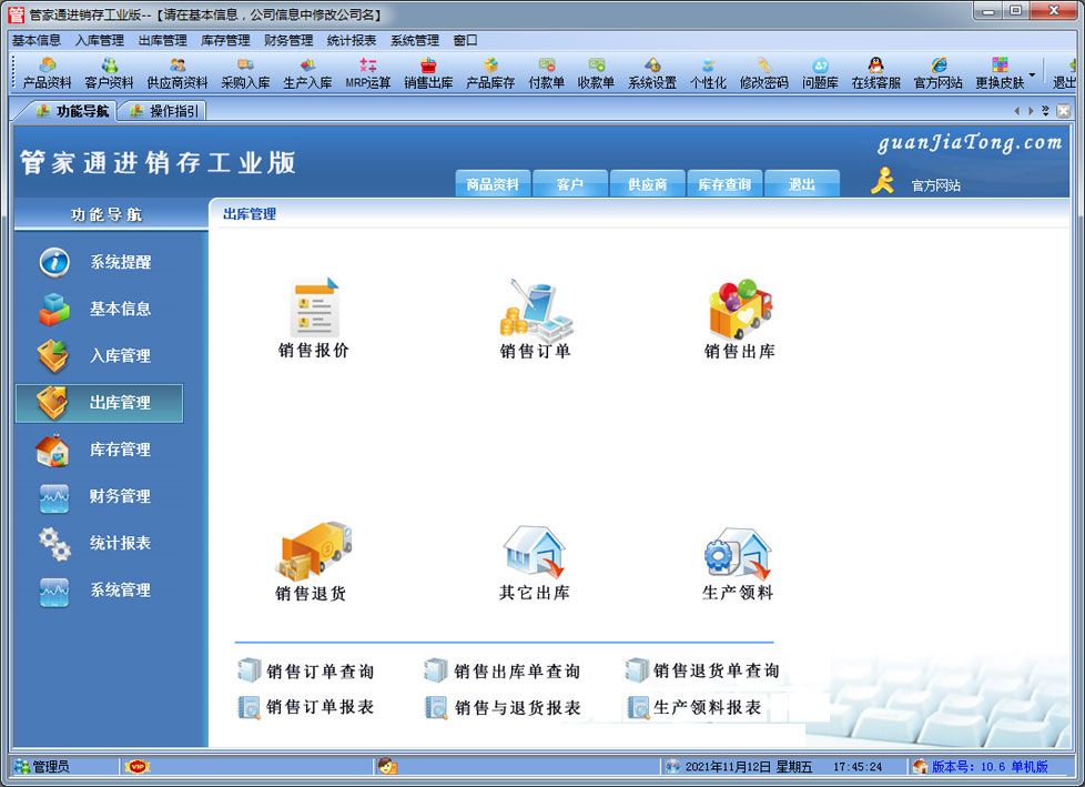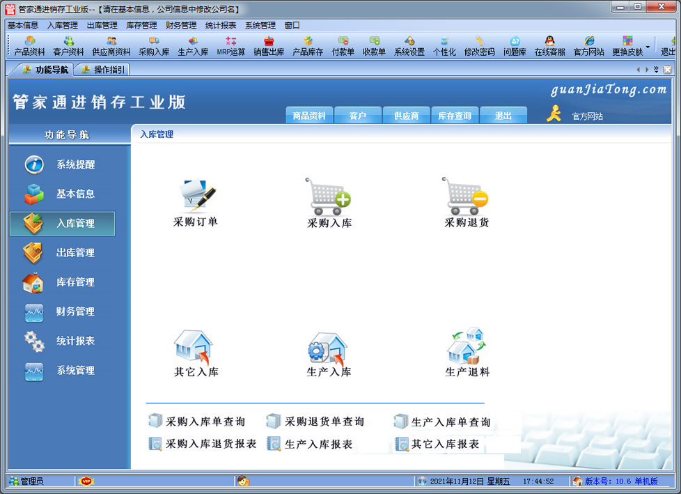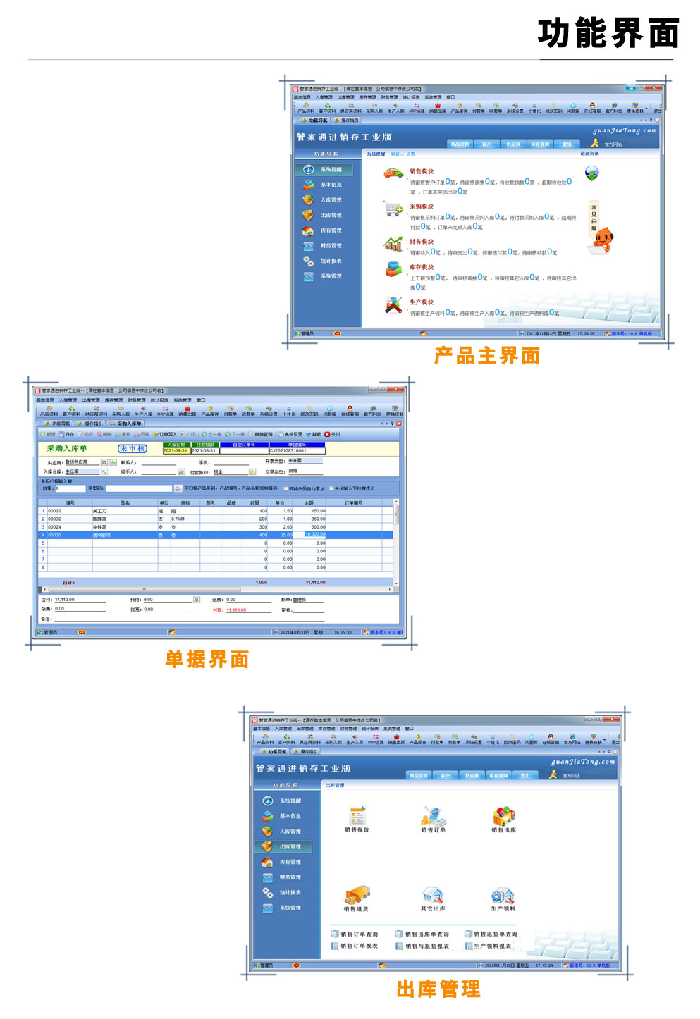 管家通進(jìn)銷存工業(yè)版是一款專業(yè)的生產(chǎn)制造企業(yè)的進(jìn)銷存管理軟件,可對成品的BOM設(shè)置,客戶訂單下達(dá)后根據(jù)BOM進(jìn)行MRP物料需求運算。其中包含產(chǎn)品銷售管理系統(tǒng) ,庫存管理系統(tǒng)(倉庫管理系統(tǒng)),財務(wù)和報表系統(tǒng)等子模塊。軟件界面設(shè)計簡潔,美觀,其人性化的軟件流程,使普通用戶不需培訓(xùn)也能很快掌握軟件操作使用方法,上手極易。強大報表與集成查詢功能是本軟件的最大特色,所有功能在用戶需要的使用地方自然體現(xiàn),不用打開多個窗口重復(fù)查詢。管家通進(jìn)銷存軟件廣泛適用于企業(yè),商貿(mào)公司,個體門店等用于商業(yè)銷售管理, 庫存管理,財務(wù)管理等,客戶管理,員工管理等場合,是您企業(yè)進(jìn)行信息化管理的強大工具。 入庫管理:進(jìn)行產(chǎn)品采購入庫,采購?fù)素,采購入庫,委外加工入庫?/p> 出庫管理:銷售訂單,銷售出庫,客戶退貨,MRP物料需求運算,委外加工發(fā)料。 庫存管理:包括庫存之間貨品調(diào)拔,庫存報損、報溢,庫存盤點功能。 財務(wù)管理:預(yù)付款、預(yù)收款,應(yīng)收應(yīng)付款,收入支出,,供應(yīng)商往來帳務(wù),供應(yīng)商付款,客戶往來帳務(wù),客戶付款 。 統(tǒng)計報表:完整的統(tǒng)計查詢功能,每張單據(jù)每次業(yè)務(wù)金額都可以清楚的反映。 權(quán)限管理:可添加刪除系統(tǒng)操作員帳號,強大的權(quán)限控制,可以設(shè)置某用戶對某窗口某個按鈕的權(quán)限。 打印設(shè)計:可對系統(tǒng)內(nèi)每個單據(jù)進(jìn)行打印的格式設(shè)計,可以導(dǎo)出,導(dǎo)入,每個操作員可設(shè)計自己的打印格式。 界面設(shè)計:系統(tǒng)窗口界面名稱可以自定義設(shè)計,表格的顯示順序,寬度,是否顯示等,每個操作員可以設(shè)計自己的界面。 系統(tǒng)設(shè)置:可以靈活設(shè)置系統(tǒng)小數(shù)位數(shù),可選0-6位,讓帳務(wù)更精確,可對以往數(shù)據(jù)進(jìn)行選擇性的清除,以便系統(tǒng)初始化。 數(shù)據(jù)備份:可隨時對系統(tǒng)數(shù)據(jù)庫進(jìn)行安全備份,以防數(shù)據(jù)丟失。 |