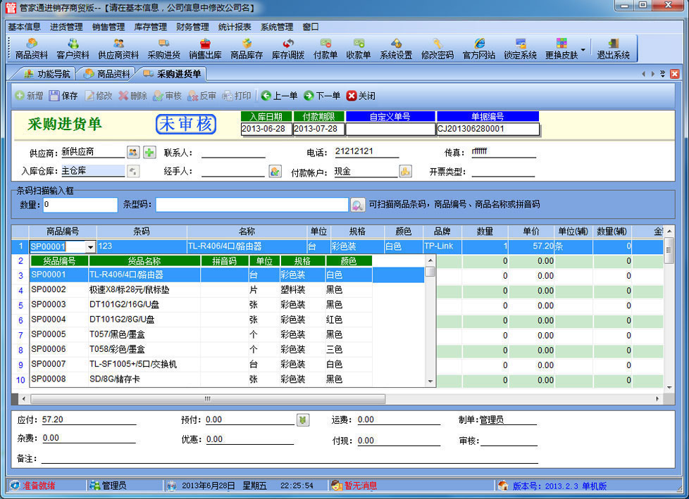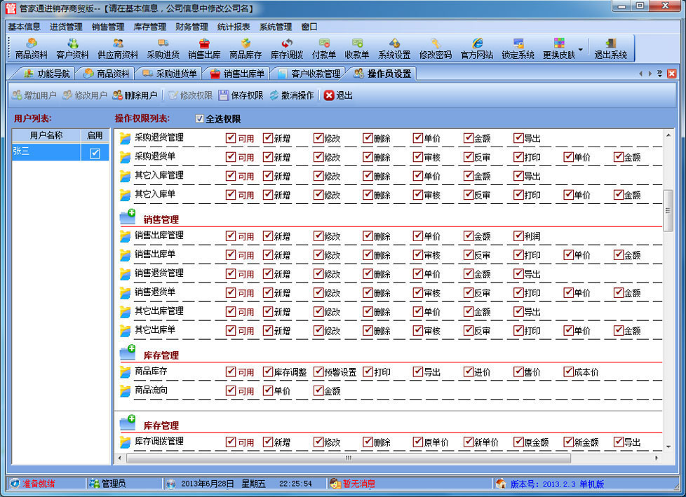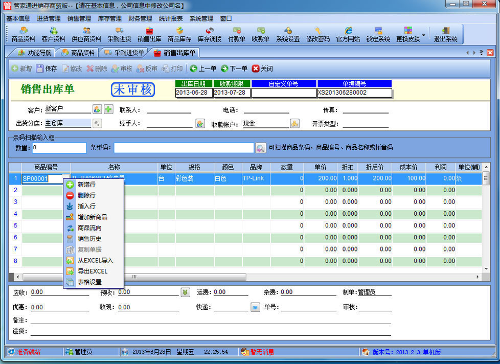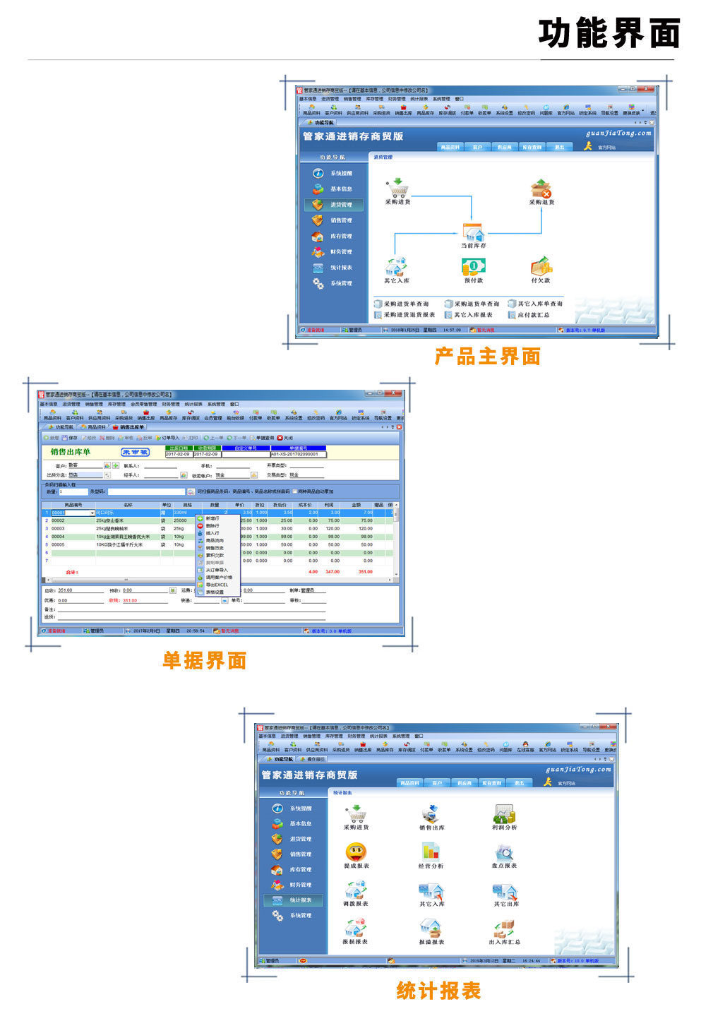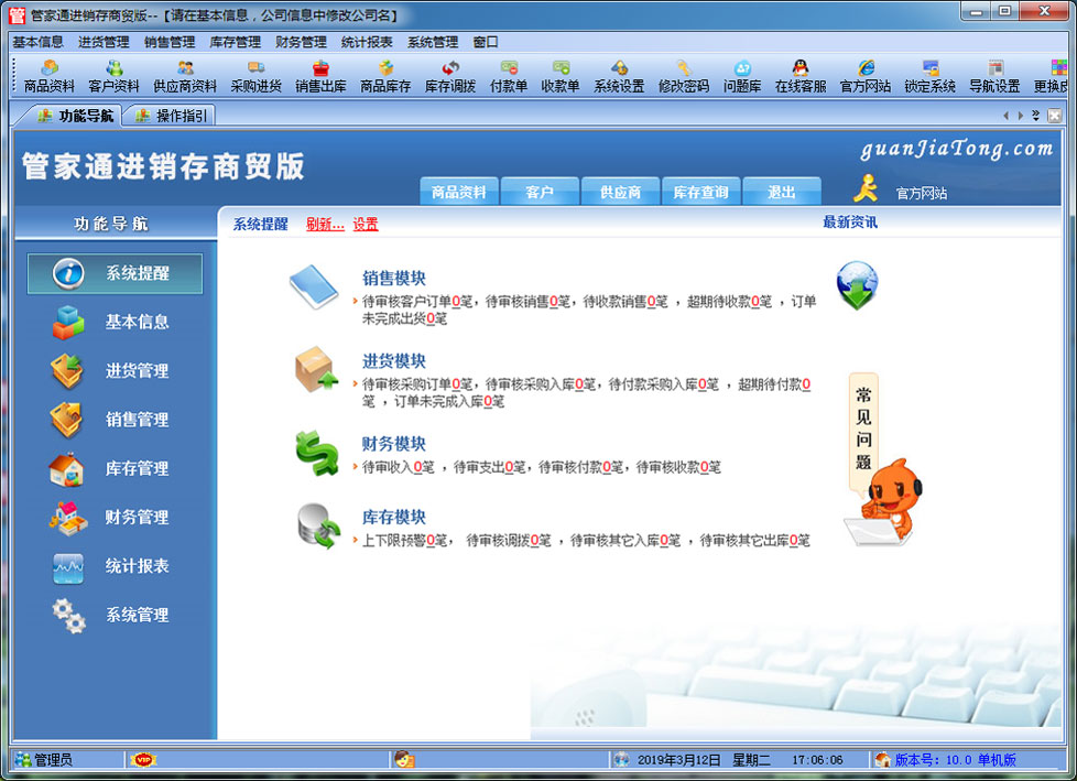 | 管家通進(jìn)銷存商貿(mào)版是一款專業(yè)的商貿(mào)企業(yè)進(jìn)銷存管理軟件,其中包含商品銷售管理系統(tǒng) ,庫(kù)存管理系統(tǒng)(倉(cāng)庫(kù)管理系統(tǒng)),財(cái)務(wù)和報(bào)表系統(tǒng)等子模塊。軟件界面設(shè)計(jì)簡(jiǎn)潔,美觀,其人性化的軟件流程,使普通用戶不需培訓(xùn)也能很快掌握軟件操作使用方法,上手極易。強(qiáng)大報(bào)表與集成查詢功能是本軟件的最大特色,所有功能在用戶需要的使用地方自然體現(xiàn),不用打開(kāi)多個(gè)窗口重復(fù)查詢。管家通進(jìn)銷存軟件廣泛適用于企業(yè),商貿(mào)公司,個(gè)體門(mén)店等用于商業(yè)銷售管理, 庫(kù)存管理,財(cái)務(wù)管理等,客戶管理,員工管理等場(chǎng)合,是您企業(yè)進(jìn)行信息化管理的強(qiáng)大工具。 基礎(chǔ)數(shù)據(jù):商品信息,供應(yīng)商,客戶,商品分類,倉(cāng)庫(kù),銀行等基本信息的設(shè)置。 入庫(kù)管理:進(jìn)行貨品采購(gòu)訂單,采購(gòu)入庫(kù),采購(gòu)?fù)素洠M(jìn)貨單據(jù)和退貨單據(jù)查詢,供應(yīng)商往來(lái)帳務(wù),供應(yīng)商付款。 出庫(kù)管理:客戶訂單,銷售出貨,客戶退貨,銷售單據(jù)和客戶退貨查詢,客戶往來(lái)帳務(wù),客戶付款。 庫(kù)存管理:包括庫(kù)存之間貨品調(diào)拔,庫(kù)存報(bào)損、報(bào)溢,庫(kù)存盤(pán)點(diǎn)功能。 拆分組裝:整進(jìn)散出,或是整出散進(jìn)等可以自由的拆分組合產(chǎn)品。 統(tǒng)計(jì)報(bào)表:完整的統(tǒng)計(jì)查詢功能,每張單據(jù)每次業(yè)務(wù)金額都可以清楚的反映。 權(quán)限管理:可添加刪除系統(tǒng)操作員帳號(hào),強(qiáng)大的權(quán)限控制,可以設(shè)置某用戶對(duì)某窗口某個(gè)按鈕的權(quán)限。 打印設(shè)計(jì):可對(duì)系統(tǒng)內(nèi)每個(gè)單據(jù)進(jìn)行打印的格式設(shè)計(jì),可以導(dǎo)出,導(dǎo)入,每個(gè)操作員可設(shè)計(jì)自己的打印格式。 界面設(shè)計(jì):系統(tǒng)窗口界面名稱可以自定義設(shè)計(jì),表格的顯示順序,寬度,是否顯示等,每個(gè)操作員可以設(shè)計(jì)自己的界面。 系統(tǒng)設(shè)置:可以靈活設(shè)置系統(tǒng)小數(shù)位數(shù),可選0-6位,讓帳務(wù)更精確,可對(duì)以往數(shù)據(jù)進(jìn)行選擇性的清除,以便系統(tǒng)初始化。 數(shù)據(jù)備份:可隨時(shí)對(duì)系統(tǒng)數(shù)據(jù)庫(kù)進(jìn)行安全備份,以防數(shù)據(jù)丟失。 3、 屏幕分辨率800X600以 |