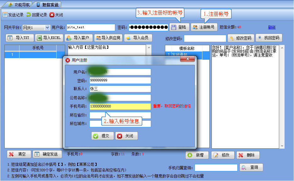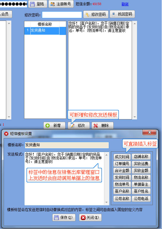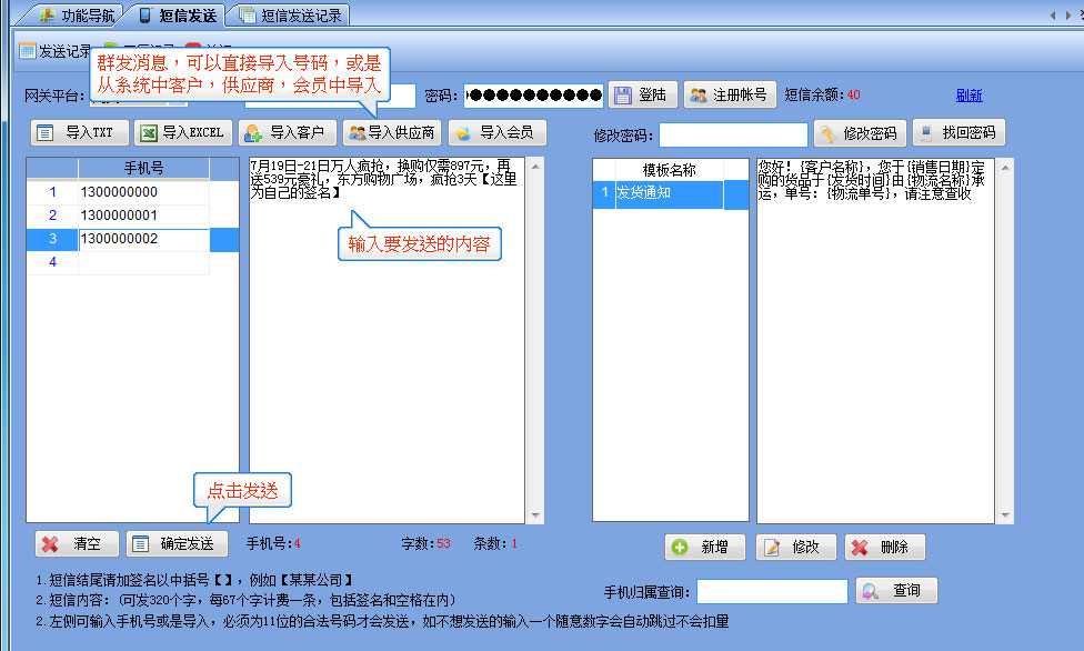 短信發(fā)送流程 1.【系統(tǒng)管理】-----【短信發(fā)送】-----打開(kāi)如圖所示,注冊(cè)好帳號(hào)和密碼,然后輸入在界面上并點(diǎn)登陸,成功后會(huì)顯示短信余額為0 2.需要群發(fā)時(shí)直接可以導(dǎo)入已有的EXCEL表格,或是TXT格式的手機(jī)號(hào),也可以從系統(tǒng)中將客戶或供應(yīng)商等手機(jī)號(hào)直接導(dǎo)入后發(fā)送 3.發(fā)貨通知消息,可在客戶訂單管理及銷售出庫(kù)管理窗口上直接將當(dāng)前單據(jù)的信息發(fā)給對(duì)應(yīng)的客戶。 |