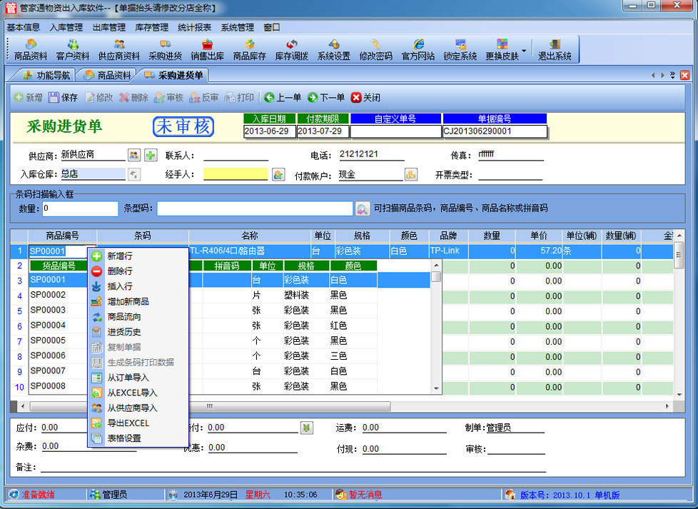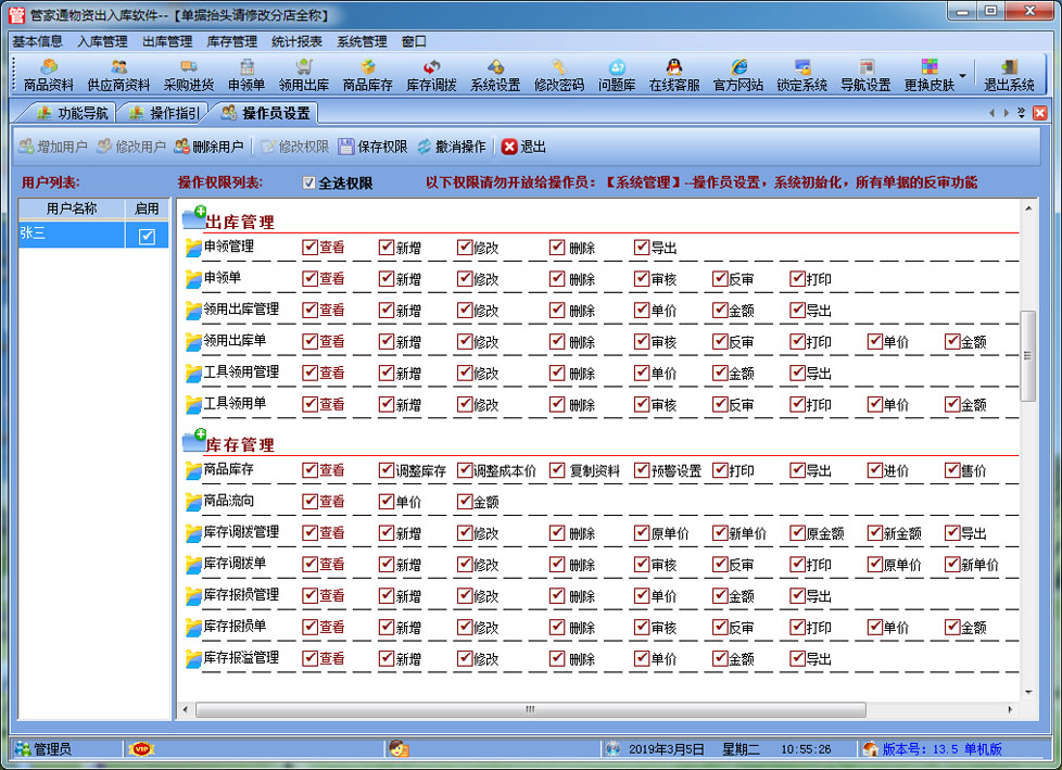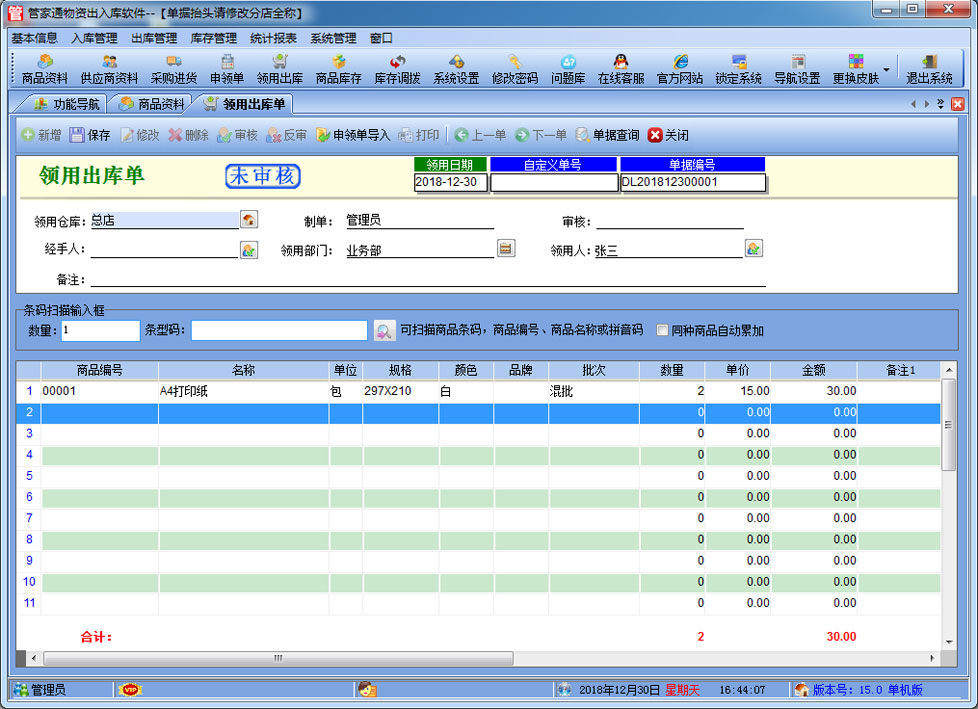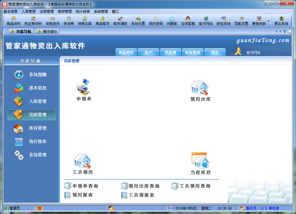 | 管家通物資出入庫管理軟件是一款專業(yè)的針對企業(yè)內(nèi)部單位庫存管理,針對內(nèi)部申領(lǐng),領(lǐng)用出庫,工具領(lǐng)用移交等,其中包含庫存管理系統(tǒng)(倉庫管理系統(tǒng)),報表系統(tǒng)等子模塊。軟件界面設(shè)計簡潔,美觀,其人性化的軟件流程,使普通用戶不需培訓(xùn)也能很快掌握軟件操作使用方法,上手極易。強大報表與集成查詢功能是本軟件的最大特色,所有功能在用戶需要的使用地方自然體現(xiàn),不用打開多個窗口重復(fù)查詢。管家通倉庫管理軟件廣泛適用于企業(yè),商貿(mào)公司,個體門店等用于商業(yè)銷售管理, 庫存管理等,客戶管理,員工管理等場合,是您企業(yè)進(jìn)行信息化管理的強大工具。 功能簡介 基礎(chǔ)數(shù)據(jù):商品信息,供應(yīng)商,客戶,商品分類,倉庫,銀行等基本信息的設(shè)置。 入庫管理:進(jìn)行物資采購入庫,采購?fù)素洠M(jìn)貨單據(jù)和退貨單據(jù)查詢。 出庫管理:申領(lǐng)管理,領(lǐng)用出庫,工具領(lǐng)用等管理。 庫存管理:包括庫存之間貨品調(diào)拔,庫存報損、報溢,庫存盤點功能。 統(tǒng)計報表:完整的統(tǒng)計查詢功能,每張單據(jù)每次業(yè)務(wù)金額都可以清楚的反映。 權(quán)限管理:可添加刪除系統(tǒng)操作員帳號,強大的權(quán)限控制,可以設(shè)置某用戶對某窗口某個按鈕的權(quán)限。 打印設(shè)計:可對系統(tǒng)內(nèi)每個單據(jù)進(jìn)行打印的格式設(shè)計,可以導(dǎo)出,導(dǎo)入,每個操作員可設(shè)計自己的打印格式。 界面設(shè)計:系統(tǒng)窗口界面名稱可以自定義設(shè)計,表格的顯示順序,寬度,是否顯示等,每個操作員可以設(shè)計自己的界面。 系統(tǒng)設(shè)置:可以靈活設(shè)置系統(tǒng)小數(shù)位數(shù),可選0-6位,讓帳務(wù)更精確,可對以往數(shù)據(jù)進(jìn)行選擇性的清除,以便系統(tǒng)初始化。 數(shù)據(jù)備份:可隨時對系統(tǒng)數(shù)據(jù)庫進(jìn)行安全備份,以防數(shù)據(jù)丟失。